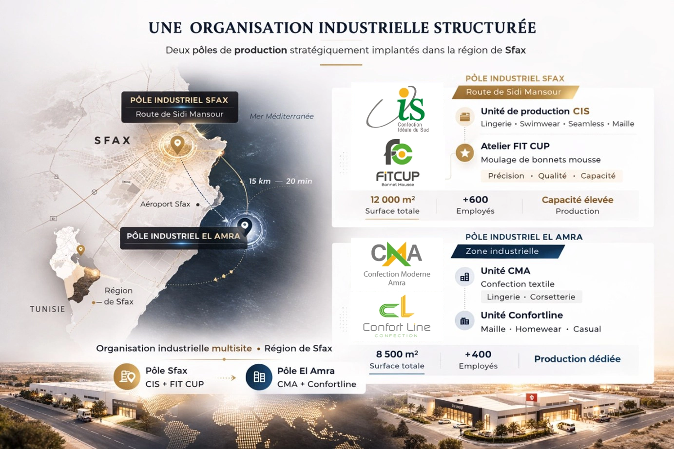 Deux pôles industriels implantés dans la région de Sfax, en Tunisie, permettant d’assurer coordination, réactivité et maîtrise des opérations.